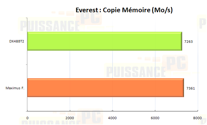 Voyons les performances de nos deux cartes mères avec la copie mémoire. Décidément c’est chacun son tour, cette fois c’est la Maximus Formula qui prend l’ascendant, un peu plus nettement ceci-dit.