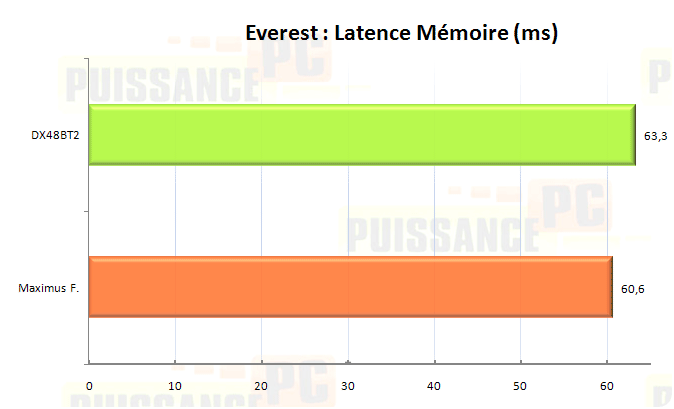 Pour finir avec les tests synthétiques, on mesure la latence (la valeur la plus petite est la meilleure). A nouveau la Maximus devant avec un gain plus marqué (5%) sur la DX48BT2.
