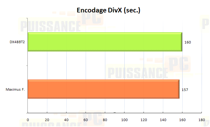 Tout d’abord qu’en est-il de l’encodage avec DivX 6.8 d’un fichier MPEG2 de 145Mo? Les temps d’encodage sont exprimés en secondes, la valeur la plus petite est la meilleure. Le couple X38/DDR2 prend une petite avance de 3s. Pas de quoi fouetter un canard chat (spécial Titi