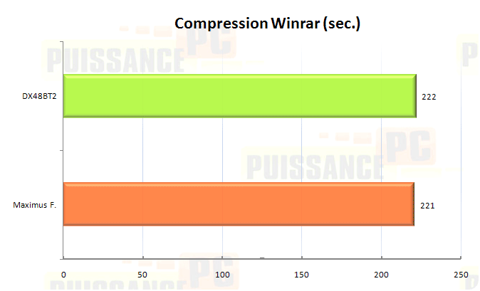 Voyons à présent la compression d’un fichier image (Ghost) de 600Mo via Winrar 3.71. A nouveau les résultats sont exprimés en secondes et donc la valeur la plus faible est la meilleure. C’était trop beau, un petit écart et patatras nouvelle égalité.