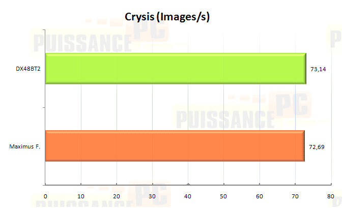 On utilise Crysis en version 1.2 à travers son Bench "CPU 1" en 800×600, détails moyens et sans filtres. Les résultats affichés ci-dessous sont issus de la moyenne en images par seconde des 3 dernières passes de test (la première est exclue car renvoyant des valeurs pour le moins inconstantes). Well well well, égalité n’est-il pas?