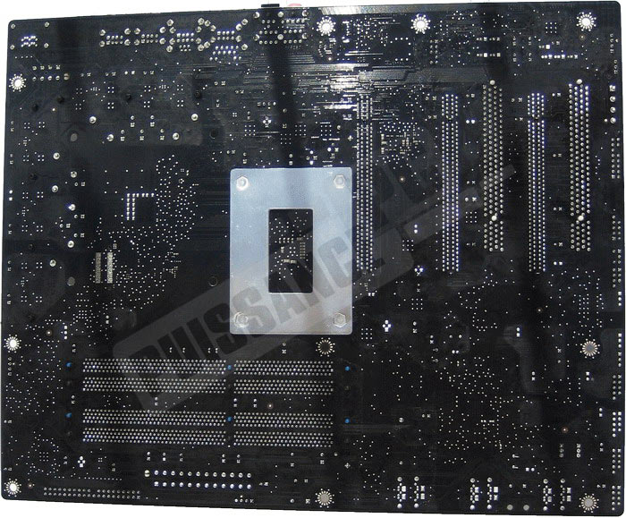 Le dos de la carte laisse apparaitre une plaque rigide destinée à compenser les contraintes issues du système de fixation du radiateur refroidissant le X48. Bien que ce dernier soit d’une taille relativement raisonnable, Intel fournit un adaptateur pour greffer en cas d’overclocking sévère un ventilateur 40mm afin de maximiser son action.