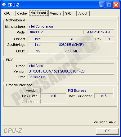 Que nous apprend CPU-Z au sujet de notre carte mère? Le X48 est correctement reconnu dans sa révision 01. En utilisant Everest 4.20, le MCH est reconnu comme étant un X38 preuve à nouveau de la similitude des deux Northbridges, ceci-dit, la version 4.50 détecte correctement cette fois le X48.