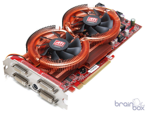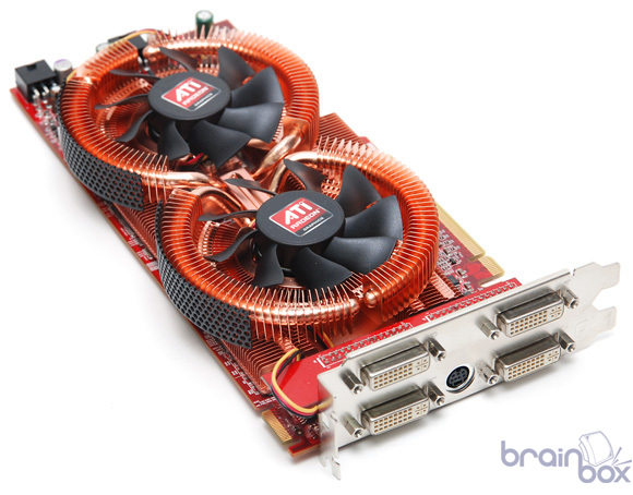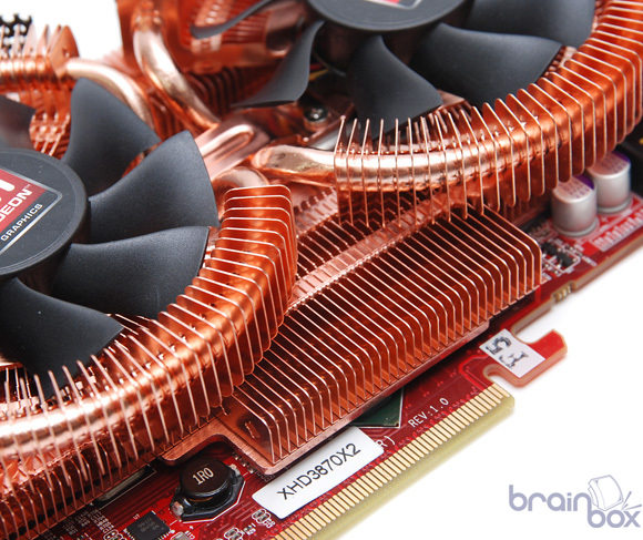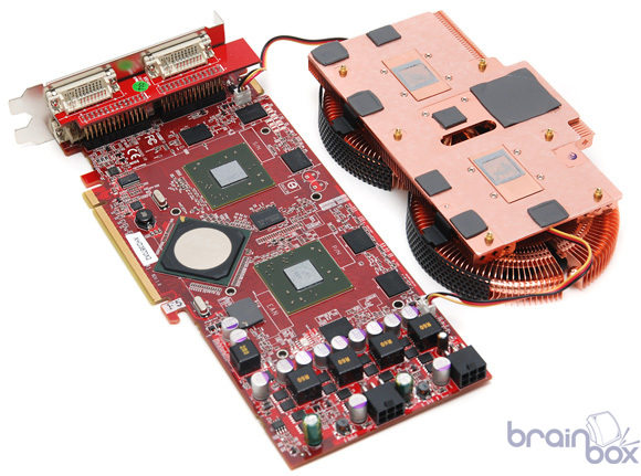 Le site Brainbox a mis en ligne des clichés d’une nouvelle HD3870 X2 X-Turbo signée GeCube. La carte est vraiment magnifique, la longueur de son PCB a été légèrement revue à la baisse et surtout elle est surmontée d’un refroidissement très impressionnant, ressemblant beaucoup à un DuOrb de Thermaltake mais encore amélioré avec une grande base en cuivre recouvrant à la fois les 2 GPUs mais également les puces mémoire. On note également la présence de 4 ports DVI, comme par exemple sur la HD3870 X2 TOP d’Asus, et les GPUs sont d’après la source un peu overclockés, à 850MHz précisément. Cette carte n’est malheureusement pour le moment que destinée au marché Coréen, espérons que GeCube change rapidement d’avis pour nous la proposer également en France. La carte sous toutes les coutures en suite de la news.