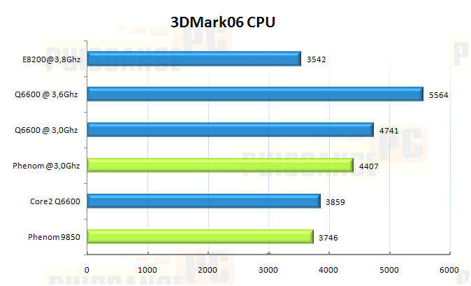 Tout d’abord le score global composé de 6 tests sollicitant les sous-systèmes graphique et CPU. C’est plus serré entre 9850 et Q6600 même si ce dernier l’emporte à nouveau d’une courte tête. A 3.0Ghz le C2Q devance le Phenom d’à peine 2.5%.