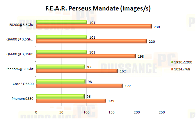Ultime benchmark de notre panel du jour, FEAR MP arrivera t-il à départager nos différents CPU? En 1024 c’est à nouveau difficile pour le Phenom qui même à 3.0Ghz ne parvient pas à concurrencer le Q6600 @stock! En 1920 les écarts se resserrent ce qui permet aux Phenom de rattraper le Q6600 d’origine mais ce dernier et l’E8200 overclockés sont encore un ton au dessus.