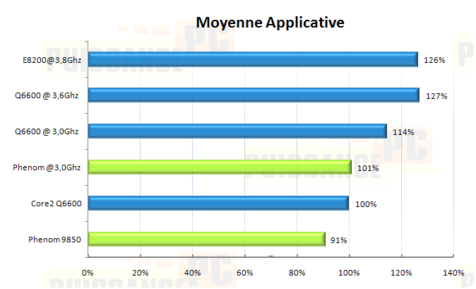 Pour synthétiser nos différents tests, voici une moyenne pondérée reprenant les résultats des applications les plus pratiques (encodage, compression, jeux) et exprimant le résultat en % par rapport à la valeur du Q6600 à sa fréquence d’origine. Le Phenom 9850 est décroché de 9% et la version overclockée à 3.0Ghz parvient tout juste à concurrencer le Q6600. C’est ainsi et même si le Phenom B3 marque un net progrès dans l’offre AMD, il n’est toujours pas apte à concurrencer le plus petit et moins cher des Quad Intel! A noter le niveau de performance atteint par un E8200 overclocké preuve que les Dual Core sont encore largement dans le coup…