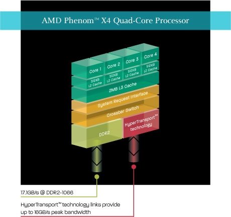Mais bon trêve d’histoire de famille, voyons un peu ce qu’AMD nous a concocté avec cette architecture Agena puisque telle est son nom. Il s’agit d’une architecture "à 4 coeurs" native (comprendre "dans la bouche d’AMD" : contrairement à Intel qui se "contente" d’accoler 2 Dual Core dans un même packaging pour arriver à ce résultat) qui si elle est plus élégante sur le papier, n’avait à l’époque du Dual Core rien apporté en pratique : le passage d’un à deux coeurs apportait des gains similaires avec les deux approches. Dans les faits, certains éléments du CPU sont effectivement mutualisés comme le contrôleur mémoire ou les 2Mo de cache niveau 3 (L3) qui fait son apparition. C’est ce qui fait dire à AMD qu’il s’agit d’un "vrai Quad Core", pour autant, chaque coeur conserve des éléments propres comme les caches L1 et L2 par soucis d’efficacité avec cette architecture, bref… Ci-dessous un diagramme fourni par AMD schématisant cette répartition des éléments.