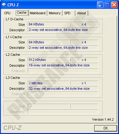 Voyons le cache afin de vérifier que l’on retrouve bien nos trois niveaux comme à l’époque du K6-3 (le 3éme niveau était présent sur la carte mère et pas le CPU ceci dit). Oui pas problème, CPUZ détecte bien tout ce petit monde à savoir les caches L1 (64 Ko) et L2 (512Ko) propres à chaque coeur et le cache L3 de 2Mo partagé entre ces derniers.