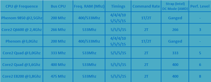Pour nos différents tests nous allons proposer un peu de concurrence à notre Phenom via l’adversaire direct du Phenom 9850 dans la gamme de prix à savoir le Q6600. Nous avons bien sur tenu compte du potentiel d’overclocking des CPU et donc intégré en sus des valeurs aux fréquences d’origine, les résultats de nos 2 CPU overclockés à leur valeur maximale stable. Comme nous l’avons vu page précédente, le Phenom a donc atteint 3.0Ghz stable quant au Core2 Q6600, les 3.6Ghz 100% stables ont été obtenus avec un FSB 400 et 1,41v. Nous avons inclus pour le Q6600 la valeur 3.0Ghz (FSB333 = QX6850) qui nous a paru pertinente afin de comparer les 2 architectures à fréquence équivalente et avec le FSB333 courant sur les CPU Intel à présent. Pour donner également une indication sur le comportement d’un Dual Core overclocké de dernière génération face à nos Quad, nous avons inclu les scores d’un C2D E8200 à 3.8Ghz, valeur 100% stable et relativement facile à atteindre avec la série des E8xxx. Voici donc en résumé les différents réglages :