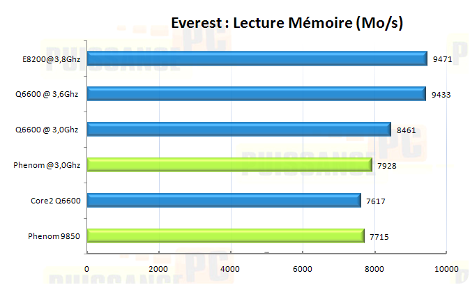 Tous les tests à venir ont été reproduits 3 fois et la moyenne des 3 tests est reportée dans les graphiques. Débutons classiquement par des tests synthétiques à savoir Everest 4.50 et ses benchs mémoire. Tout d’abord la lecture mémoire. Petit avantage au Phenom 9850 face au Q6600 stock. Lorsque l’on overclocke, le gain est limité sur Phenom car la vitesse du Bus CPU reste identique alors que le Core2 se délecte des FSB 333 et surtout 400 pour faire la différence. En passant ce sont d’ailleurs les FSB utilisés en standard sur les nouveaux Core2 (400Mhz sur QX9770).