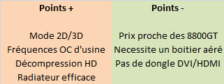 - Et c’est là tout le paradoxe Nvidia : le gap de prix entre les cartes 9600 et 8800 est vraiment très faible, aussi il faut bien analyser vos besoins en terme d’usage. Et à ce jeu là, la Gigabyte est parfaite pour un usage multimédia avec la lecture HD ou encore des performances excellentes en jeu bien qu’en retrait par rapport à la 8800GT. Les possesseurs de boitiers ventilés peuvent aussi se ruer sur la carte qui affichera des températures basses. Attention, bien ventilé ne signifie pas bruyant, loin de là. Récapitulons nos pensées dans ce tableau si vous le voulez bien: