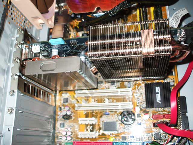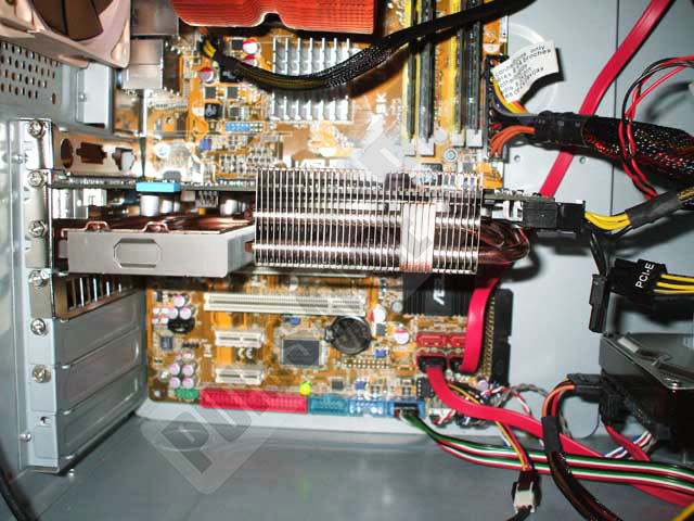 - La chaleur, c’est bien connu, ça monte. Si vous êtes attentifs aux photos, vous constaterez que le radiateur est "tête en bas", et donc la chaleur qui monte sera barrée par le pcb de la carte. Ce problème est majoré dans les tours verticales comme celle du test. Dans un boitier HTPC horizontal, elle aura moins de difficulté à se déplacer dans le boitier au grès des flux d’air.