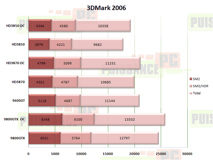 - Maintenant que nous sommes rassurés par les températures de nos cartes, surtout la 9600GT, il est donc temps de leur donner du grain à moudre. Le premier de nos tests est le classique 3DMark 2006. Le processeur étant l’élément stable avec les barettes mémoire, seules les notes GPU changent lors de l’overclocking des cartes.