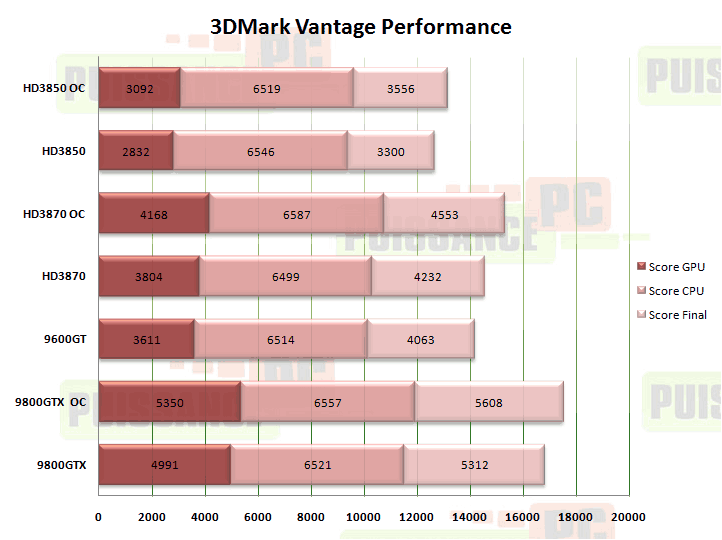 - Vantage, lui, est plus nuancé sur le résultat final. Ici la HD3870 est supérieure à la 9600GT, sans que cela ne génère une différence à l’écran. 10 ou 11 fps, ce n’est pas cela qui procure un réel avantage. Et puis Vantage n’est pas un jeu, ce n’est qu’un benchmark qui ménage la chèvre et le chou, comprenez AMD et Nvidia. La 9800GTX reste devant, la HD3850 ferme la marche, c’est une situation qui risque de se reproduire souvent, mais qui est somme toute logique.