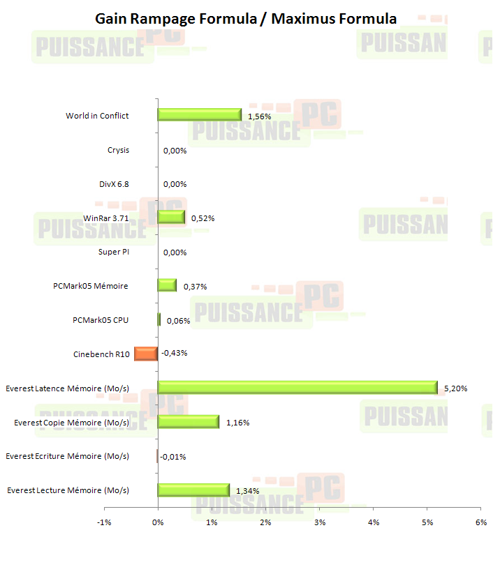 Pour rappel, la Rampage dispose lors des tests d’un petit avantage que lui confère son bios, c’est à dire la possibilité de valider le PL à 6 alors qu’il a fallut se contenter de 7 avec celui de la Maximus. A PL équivalent les performances sont identiques ou presque. Voyons en pratique les gains apportés par la Rampage avec son réglage optimal face à la Maximus et son réglage optimal avec notre E8200 à 3.2Ghz :