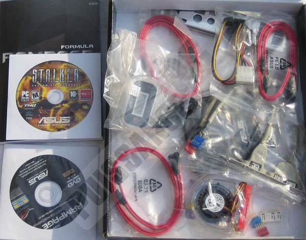 A l’ouverture on retrouve le bundle classique des cartes ROG avec de manière non exhaustive des câbles SATA/IDE/Floppy, le LCD Poster toujours très pratique en cas de soucis, la plaque arrière pour les boitiers ATX, un bracket USB/Firewire, un ventilateur optionnel destiné aux radiateurs en cas de watercooling CPU …