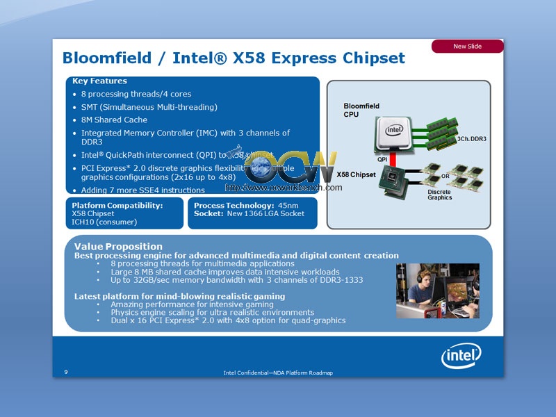 Alors que le chipset X48 commence tout juste à débarquer sur le marché on parle déjà du futur X58 qui apportera tout un lot de nouveautés. Le site OCWorkbench vient de publier une documentation Intel se rapportant au fameux X58. On y apprend qu’il sera accompagné de l’ICH10 (qui arrivera avec le P45) et sera le premier à supporter les processeurs Nehalem d’Intel. L’actuel FSB sera remplacé par un lien QPI (QuickPath Interconnect) qui sera capable de gérer de nombreuses lignes PCI-Express et permettra ainsi de proposer deux PCI-E 16x ou quatres PCI-E 4x. Le contrôleur mémoire sera supprimé car il sera intégré au processeur. Le Bloomfield (nom de code de la nouvelle génération de CPU) apportera lui aussi son lot de nouveautés, qui, couplées avec le x58 devrait faire un carton. S’ajoute à cela le site Expreview qui a dévoilé une roadmap du géant de Santa Clara, annonçant que ce chipset sera le remplaçant du futur haut et moyen de gamme d’Intel (adieu futur P45 et X48), simplifiant ainsi sa gamme. Plus d’images et d’infos en suite de cette news.