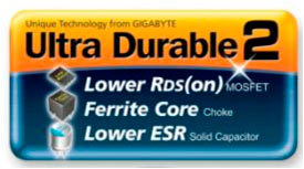 La particularité des condensateurs solides et d’être contrairement à leur ancêtres électrolytiques dotés de coeurs conducteurs basé sur des éléments solides (des polymères) et non plus des éléments liquides (des gelées conductrices pour être plus précis, ce n’est pas non plus de l’eau !). Ils sont de ce fait moins soumis aux conditions externes (température, humidité..), les temps de chargements/déchargements sont réduits, peu chers à produire (les polymères sont des composés de synthèse) et ont des plages de résistance série assez larges. Cette résistance série (ESR) est l’attribut principal qui permet de quantifier la capacité d’un condensateur à traiter un courant. Les condensateurs implémentés sur les cartes mères ultra durable 2 sont des condos Low ESR, capables donc d’emmagasiner de grosses quantités de jus sans faire exploser votre PC. En bref : plus de solidité, plus de fiabilité. Gigabyte à choisi de n’intégrer que des condos issus des spécialistes Japonnais que sont Chemicon et Fujitsu, là ou d’autres constructeur s intègrent des composants plus.. no-name. Un réel impact sur la durabilité de ces derniers ? Difficile à dire.