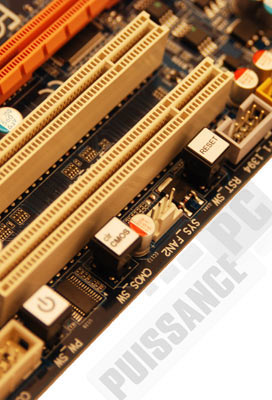 Cela faisait un moment que les power users les demandaient, les voici enfin arrivés : les switch power, reset et clear Cmos directement sur le PCB (en plus des traditionnels pins pour les boutons boitier) Intégrés à partir du modèle EP45-DS3P (voir 1ère page). Pas grand chose à dire la dessus (ah si, ils s’illuminent en bleu, youpi !) sauf que ces switchs sont juste très pratique lorsque vous êtes hors boitier.