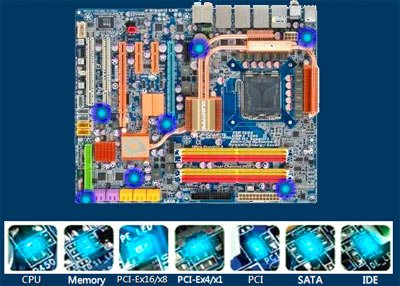 Plus gadget, le système de diagnostique par LED. Chaque point crucial des composants du système de la carte mère est associé à une LED bleue qui s’illumine brièvement durant le POST : processeur, mémoire, PCIe x16/x8, PCI, sATA et IDE. Si un problème est détécté, le LED correspondante restera allumée vous indiquant clairement l’origine supposée du souci. Peut être moins pratique mais beaucoup plus sexy que les afficheurs digitaux déjà vu sur des cartes mères haut de gamme; type d’afficheur que l’on retrouve néanmoins sur la EP45 extreme.