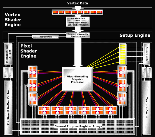 Il n’est pas encore question d’un pipeline unifié, capable de traiter aussi bien les vertex que les pixels shaders, même si avec le R580 on s’en rapprorche d’un point de vue fonctionnel.