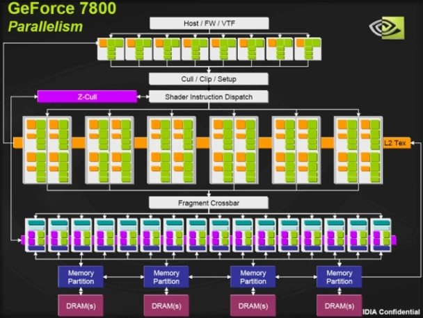 Ayant pour architecture fondatrice le NV40 (6800), le G71 mise tout sur une architecture de type Longue Pipeline. Grossièrement, chez Nvidia (avant le G80), les pipelines ne sont pas dissociées. Ainsi, il y a 2 unités de calcul par pipeline de traitement de pixel shaders. Ces unités de calcul spécifiques sont donc dédiées à telle ou telle tâche et en engendrent ainsi un cheminement linéaire des pixels.
