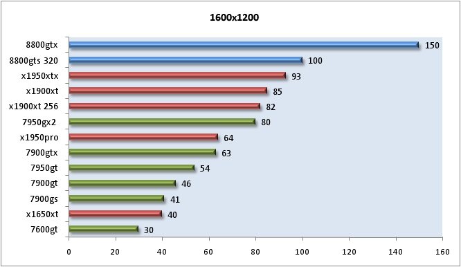Les choses sont claires, les x19xx/x1650xt dominent les 79xx/7600. Par contre, le G80 met tout le monde d’accord. Notez la différence de performances entre la 8800gtx et les autres cartes ancienne génération.