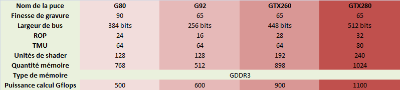 Après donc avoir entendu beaucoup de choses plus ou moins vraies, un ensemble de valeurs semble se détacher et constituer très certainement les caractéristiques finales techniques des GTX 280 et 260. Hormis les fréquences de fonctionnement des core/shader/mémoire, tout ou presque est connu des cartes ayant la lourde tache de succéder aux 8800GTX/Ultra/GTS. Les p’tites p’tites fillotes auront pas mal de peps dans la culotte, aussi voici un tableau comparatif entre le G80, G92, GTX280 (code D10U-30)et GTX260 (code D10U-20) :