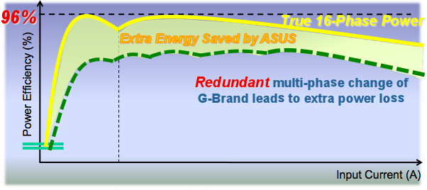 Comme vous pouvez le voir ci-dessous, les 16 phases (virtuelles) améliorent fortement le rendement électrique (selon Asus bien sur).