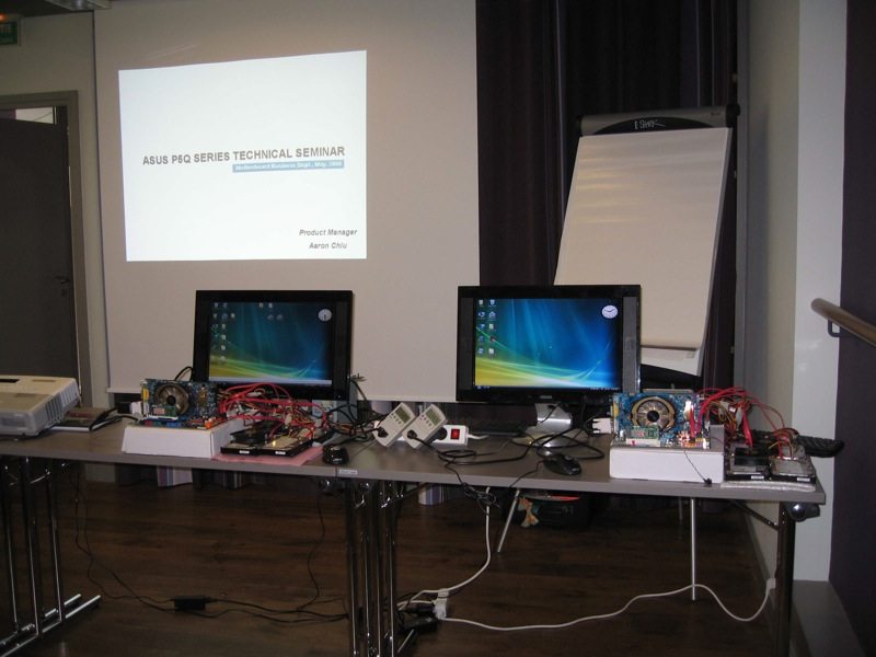 Cette conférence était l’occasion idéale pour présenter et afficher le matériel du constructeur. Une petite salle sombre, un peu cachée, la caverne d’Ali…pleine de cartes mères P45, cartes graphiques, etc, il y en avait pour tous les goûts…