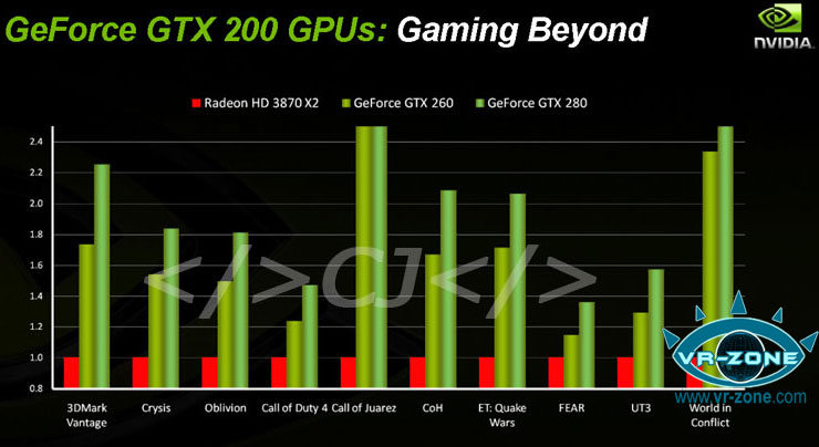C’est en effet ce que CJ a pu envoyer comme information à nos confrères de VRZone. Si on en croit le jeune homme, les GTX devraient être accompagnées par les pilotes Geforce 177.xx. La HD3870 X2 quant à elle a été benchée avec les Catalyst 8.3, qui sont loin d’être les plus mauvais avec cette carte. Petite subtilité, le graphique qui arrive montre non pas les ips, mais le rapport de performance en prenant 1 pour la HD3870 X2. Les jeux testés sont nombreux, citons Crysis qui continue à faire souffrir les cartes, COD4, Oblivion, 3DMark Vantage (OK c’est pas un jeu….) ou encore UT3. Il y en a encore quelques uns ayant peu d’intérêt selon Bossracuda. Une chose est sure, après la Nvidia conférence tenue aux US la semaine dernière, et celle qui arrive en France très prochainement, ces résultats ont plus de valeur que jamais, même si rien ne vaut les bons tests faits maison, moulés à la louche, avec amour, avec beaucoup de Watts bouffés et d’heures passées pendant que madame s’endort devant "La Nouvelle Star".