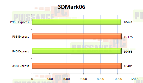 Tout d’abord le score global composé de 6 tests sollicitant le sous-système graphique et CPU. A nouveau une mini hiérarchie (X48 trés (trés) légèrement devant puis P35/45 juste derrière) dans l’égalité