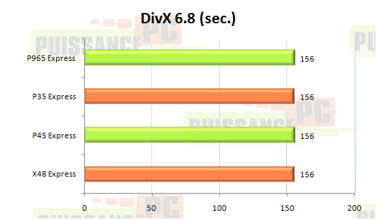 Tout d’abord qu’en est-il de l’encodage avec DivX 6.8 d’un fichier MPEG2 de 145Mo? Les temps d’encodage sont exprimés en secondes, la valeur la plus faible est la meilleure.