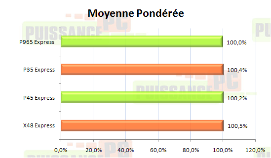 Pour analyser la situation (vu les benchs c’est inutile mais bon j’avais envie de faire un compte rond pour les graphiques !) rien de tel qu’une bonne vieille moyenne pondérée exprimée en pourcentage par rapport au niveau de performance de l’ancêtre P965.