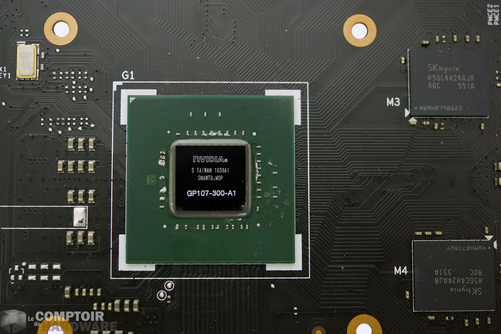 Autre détail, le petit TW en haut à gauche, qui semblerait nous dire Taiwan. Difficile toutefois d’en tirer un quelconque enseignement concernant le fondeur retenu, puisque durant l’ère Pascal, Samsung produisait les GP107 pour Nvidia, avec un marquage Taiwan également pour ces derniers, comme le rappelle ce cliché d’une GTX 1050. Rien n’empêche d’imaginer une situation similaire avec Ampere, à savoir TSMC pour les puces complexes (le A100 étant bel et bien produit par TSMC) et Samsung pour l’entrée de gamme. (Source Chiphell)