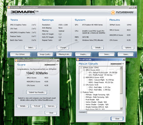 La tant attendue HD 4850 vient d’être benchée par nos confrères d’OCWorkBench. La machine de teste reste "mystérieuse", la seule chose qu’on sait c’est que le CPU était un Q6600 overclocké à 3Ghz pour l’occasion. La carte a été benchée sur 3D Mark 2006 et 3D Mark Vantage. Passons aux résultats : sur 3D Mark ’06 la carte totalise un score de 12 494 points en 1280×1024 et 10 442 points en 1920×1200. Sur 3D Mark Vantage en mode "Extrême" 2 789 points et 6 695 points en "Performance". Ces résultats sont bien sur à prendre avec des moufles car non-"officiels". Cela dit, si on les considère vrais, cela laisse présager du très bon avec grosso modo des performances comme la 9800GTX. Les screens en suite de cette news.