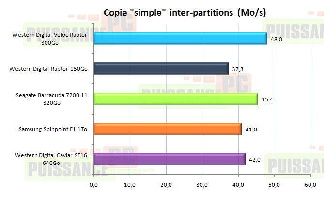 Pour conclure nos tests de performances, nous avons réalisé deux tests personnalisés correspondant à l’usage courant d’un HDD. Le disque est scindé en 2 partitions de même taille et l’on copie des données de la partition 1 à la partition 2. Les résultats sont exprimés en Mo/s. Dans un premier temps on réalise la copie d’un seul fichier d’une taille de 1.63Go. Le VelociRaptor se réapproprie la première place, le 7200.11 revient dans la course en devançant les Caviar SE16 et Samsung F1. Le Raptor est quant à lui toujours abonné à la dernière place.