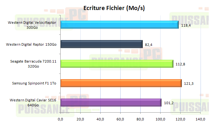 Ultime test HDD de PCmark05, File Write éprouve les capacités en écriture des disques durs. Là, c’est une courte victoire du F1 1To devant le VelociRaptor et le 7200.11. Derrière on retrouve le Caviar puis à bonne distance le Raptor 150Go à nouveau dernier…