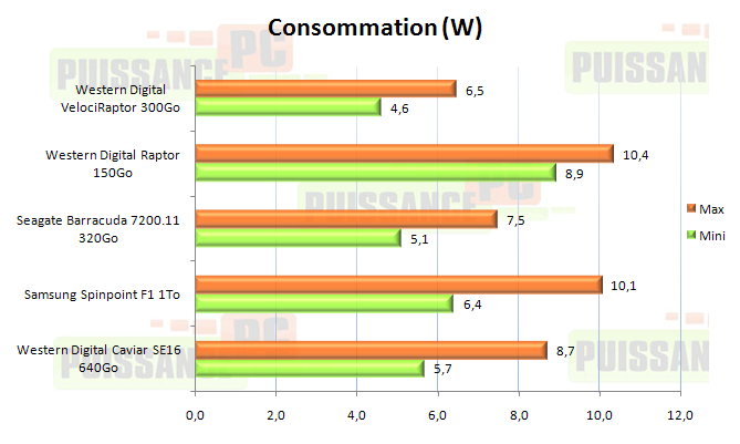 Voyons les résultats en termes de consommation électrique. Le score mini correspondant au disque en rotation sans accès alors que le score maxi correspond lui au maximum relevé durant la période d’initialisation du disque au démarrage. Le VelociRaptor profite à nouveau de son format moindre pour se distinguer au niveau de la consommation. Derrière parmi les 7200tr/mn le classement suit le nombre de plateaux, le Raptor et ses 2 plateaux à 10000tr/mn étant le plus gourmand.