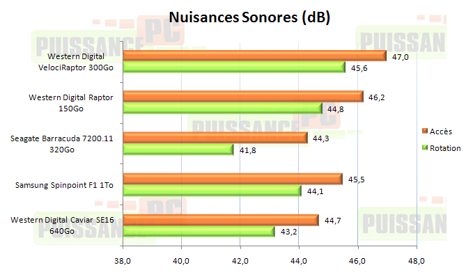 Voyons les valeurs lors des accès et au repos (c’est à dire le disque en rotation simple). Le 7200.11 est clairement le plus silencieux en rotation avec son unique plateau, derrière le Caviar se fait un peu plus discret que le F1 et le Raptor. Quant au VelociRaptor, c’est clairement une déception car non seulement il est mesuré comme étant le plus bruyant, mais plus grave, les sonorités émises en rotation sont très aigues et donc désagréables. Difficile d’oublier ce "sifflement" dans une configuration silencieuse.