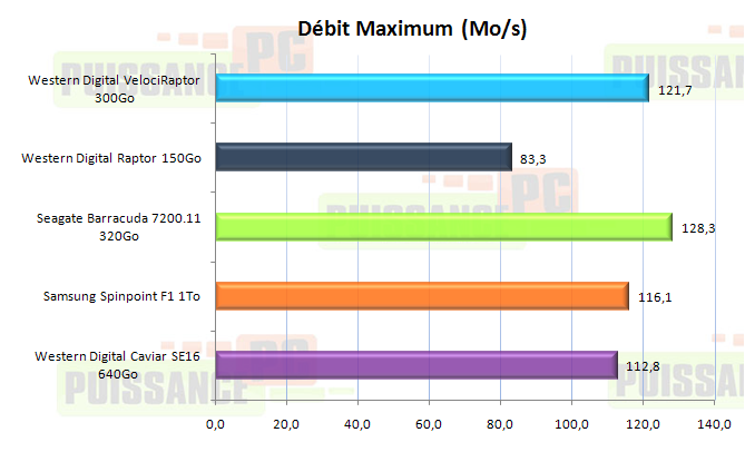 Voyons le Maximum atteint en début de disque. Confirmation, le 7200.11 met tout le monde d’accord en fleurtant avec les 130Mo/s! Le VelociRaptor quant à lui se "contente" d’un gros 120Mo/s, tandis que l’écart entre les F1 et Caviar est lui du même ordre que celui de la moyenne soit 3Mo/s. Le Raptor se montre ici 50% moins rapide que le nouveau né, il était grand temps de le remplacer…