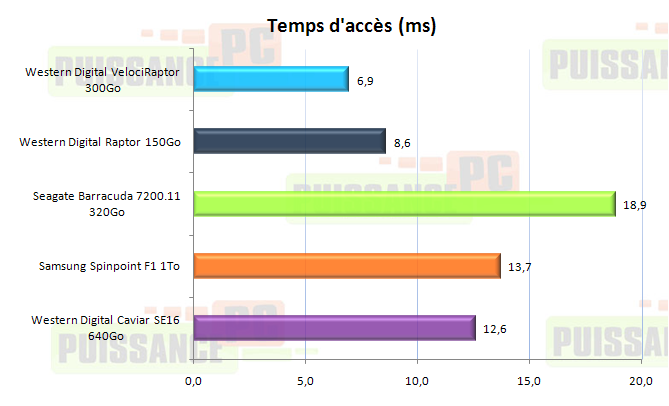 Finissons H2benchw par la mesure d’un paramètre autrement plus influant sur les performances, à savoir le temps d’accès. Pas de secret, pour le réduire la meilleure technique consiste à augmenter la vitesse de rotation, les disques à 10000tr/min mettent tout le monde d’accord et le VelociRaptor profite de son format 2"1/2 pour devancer de 20% le Raptor 150Go. Dans le combat des 7200tr/mn, le Caviar SE16 est le plus performant en collant plus d’une milliseconde au F1. Quant au 7200.11, il confirme le résultat catastrophique d’HDTach avec près de 19ms…