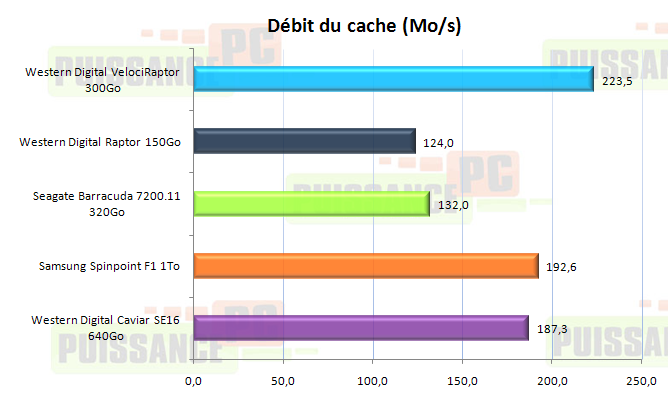 Le "Core" test permet de mesurer le débit du cache embarqué au travers de l’interface SATA. Voyons comment nos différents disques communiquent avec l’ICH9R de la Maximus. Le VelociRaptor domine à nouveau la concurrence, le F1 et le Caviar (ne se lâchant décidément pas) étant relégués à une trentaine de Mo/s. Inexplicablement, le 7200.11 marque le pas alors que sous HDTach au test similaire il était au niveau voire légèrement devant les F1 et Caviar. Ce résultat est pourtant systématiquement reproductible. Le Raptor est encore une fois en dernière place mais à sa décharge il n’utilise qu’une interface 150Mo/s contre 300Mo/s pour les autres disques.