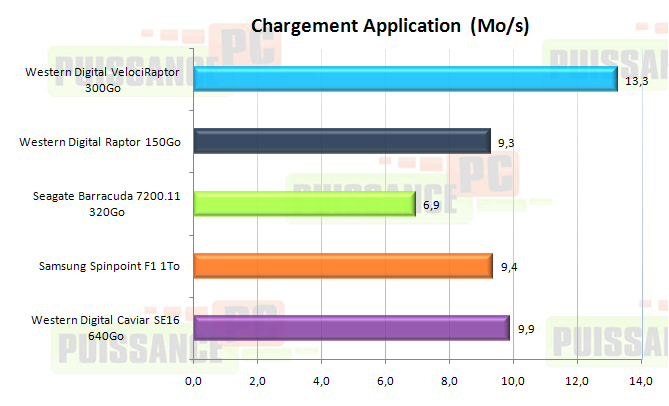 Passons au second test dénommé Application Loading qui comme son nom l’indique simule les opérations de chargement de diverses applications. A nouveau le VelociRaptor devance nettement un trio relativement proche composé dans l’ordre des Caviar, F1 et Raptor. Le 7200.11 fait presque 2 fois moins bien que le VélociRaptor et se retrouve fort loin des autres disques 7200tr/mn!