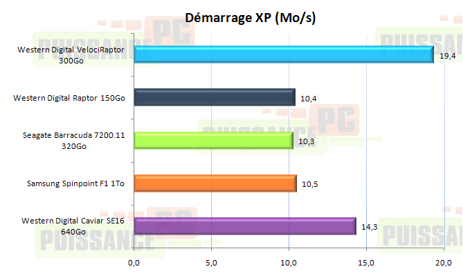 Débutons PCMark05 par le test XP Startup simulant le démarrage de Windows XP. Faisant aussi bien appel au taux de transfert qu’aux temps d’accès vu le nombre de fichiers à charger c’est un test intéressant. A ce petit jeu c’est clair et net, le VelociRaptor ne craint personne. C’est d’ailleurs un carton plein de Western Digital car le CaviarSE16 640Go devance nettement les autres disques 7200tr/mn. le Raptor 150Go égale quant à lui le Samsung F1 et le Seagate 7200.11 est la preuve incarnée que le débit ne fait pas tout : handicapé par son temps d’accès catastrophique il est loin du VelociRaptor alors qu’il est au même niveau en termes de débit.