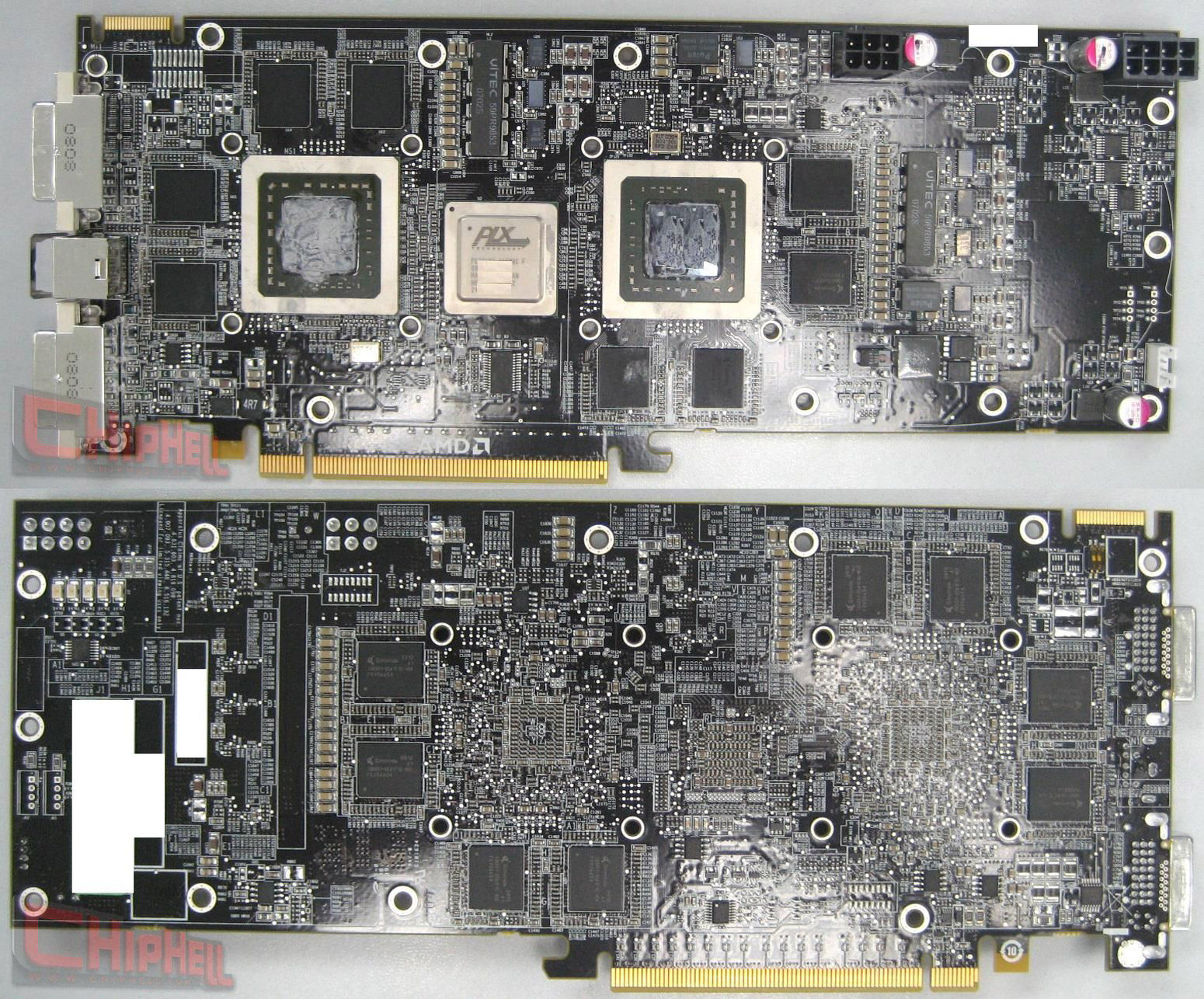 Le site ChipHell vient de mettre en ligne les premiers clichés de ce que serait le R700, alias HD4870 X2. La carte embarquera donc 2 cores de HD4800, sur un même PCB à la longueur interminable. Au niveau de l’alimentation on resterait (si le design est définitif) à un simple 8pins + 6pins. Une chose est sûre: ATI doit rencontrer de petits soucis en termes de consommation, car si la HD3870 X2 était finalement tout à fait viable car basée sur une version doublée de la HD3870, qui ne consomme que 85W environ en pleine charge, laa HD4850 consomme déjà plus de 100W et la HD4870 dépasse allègrement les 120W. Cette HD4870 X2 sera donc un monstre de consommation et de chauffe, il sera intéressant de voir si ATI est parvenu à suffisamment améliorer son refroidissement dual GPU depuis la HD3870 X2, au risque sinon de températures en burn avoisinant les 100°…