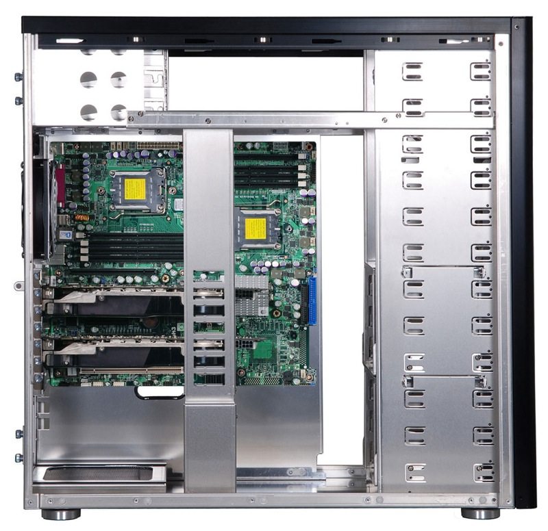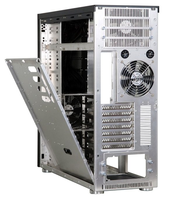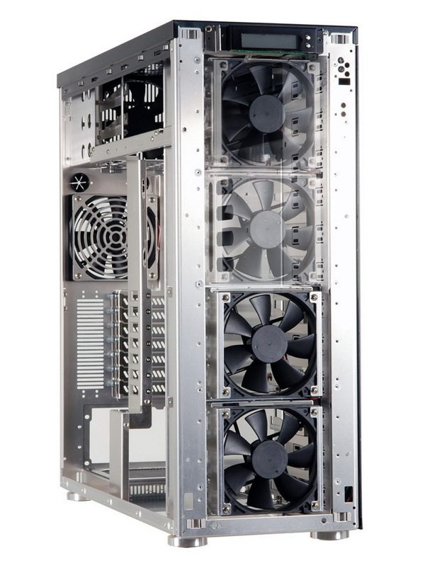 Le célèbre constructeur vient d’annoncer un nouveau boîtier haut de gamme : le PC-A77. Géant, c’est le moins qu’on puisse dire avec des mensurations de 220 x 595 x 590 mm ! Tout en aluminium, ce dernier peut accueillir 12 périphériques 5,25" que vous pourrez utiliser pour vos disques durs 3,5" grâce à l’utilisation de cages à hdd. Côté ventilation tout a bien été pensé. Il dispose en tout de 6 emplacements pour des ventilateurs de 120 mm : 4 en façade, et deux à l’arrière. Quatre ventilateurs seront fournis, tournant entre 1020 et 1500tpm. Le tout sera monitoré par un rhéobus avec un LCD qui est situé en haut de la façade. L’alimentation se placera en haut ou en bas, de préférence en bas puisqu’elle bénéficiera d’une grille spéciale permettant à l’air frais de rentrer. En façade vous trouverez sur la partie supérieure les connectiques suivantes : 4 ports USB 2.0, 1 port FireWire, 1 port e-SATA et les prises audios. Entièrement démontable et configurable à souhait, il devrait être disponible d’ici la fin du mois, pour un prix avoisinant les 300euros… Plus d’images en suite de cette news