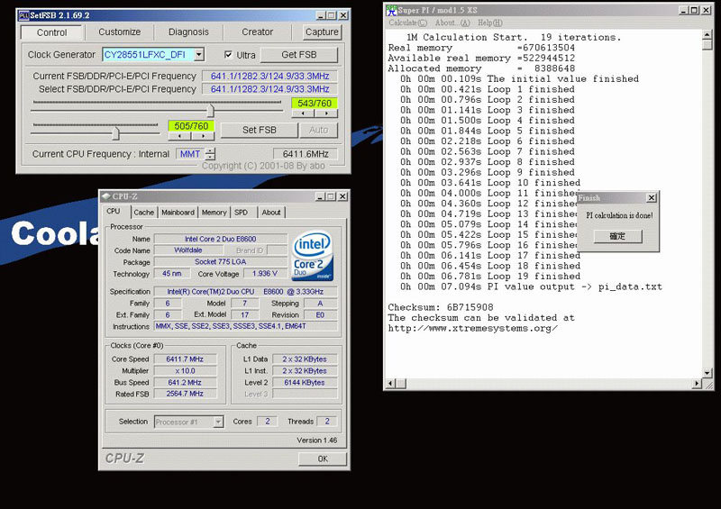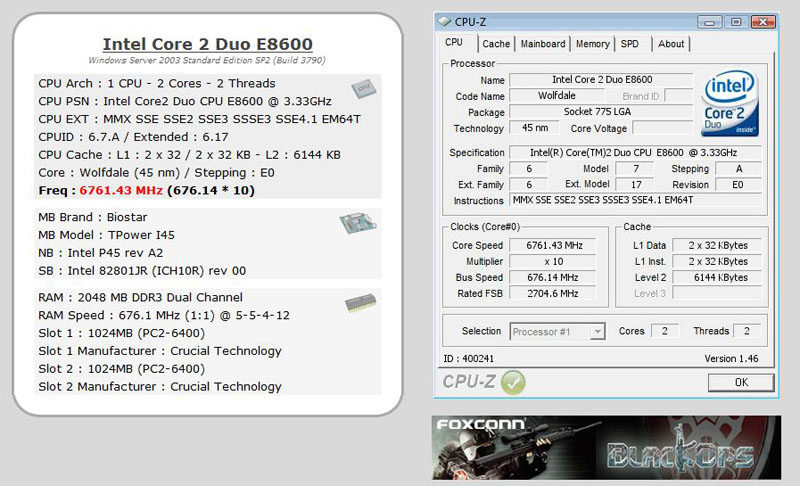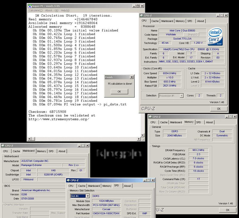 Le tout nouveau E8600 qui rappelons le, propose une fréquence 3.33Ghz avec son coefficient de 10, fait actuellement des étincelles et s’approprie les records du monde dans la plupart des disciplines d’overclocking. On vous parlait il y a peu d’un 7.281s au Super Pi 1M, ce n’était qu’un échauffement, la barre se rapproche maintenant des 7s avec un très joli 7.094s ! Chose intéressante, ce WR est partagé entre deux overclockeurs : Coolaler avec son E8600 @ 6411 Mhz sur base P35/DDR2 et K|ngp|n avec 123 Mhz de plus sur une base X48/DDR3. Du coté français, notre Boblemagnifique national fait honneur et décroche le record du monde de fréquence sur Core 2 avec un…magnifique 6761 Mhz sur carte mère Biostar TPower I45 ! Plus qu’à voir ce que donnera ce processeur au Super Pi. Tous les screens sont présents en suite de la news.