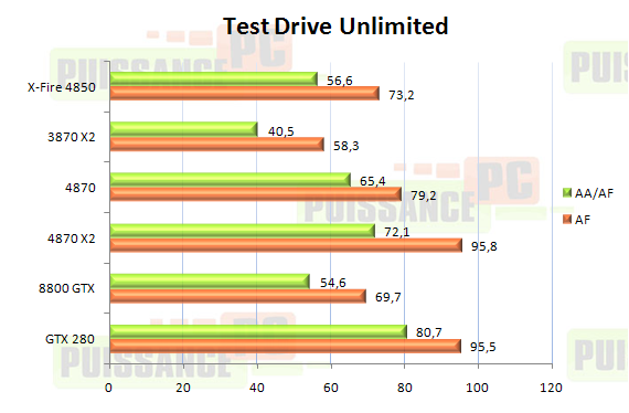 Favorable aux cartes nVIDIA bien qu’il s’agisse d’une adaptation de la XBox 360, le scaling n’est ici pas très efficace, la Radeon 4870 X2 ne parvenant pas à suivre la GTX280 avec AA et contre performance du Cross-Fire de 4850 (bug à priori mais reproductible…). Ceci-dit et comme souvent au cours de notre test, toutes les cartes fournissent un résultat suffisant pour jouer confortablement dans ces conditions poussées!